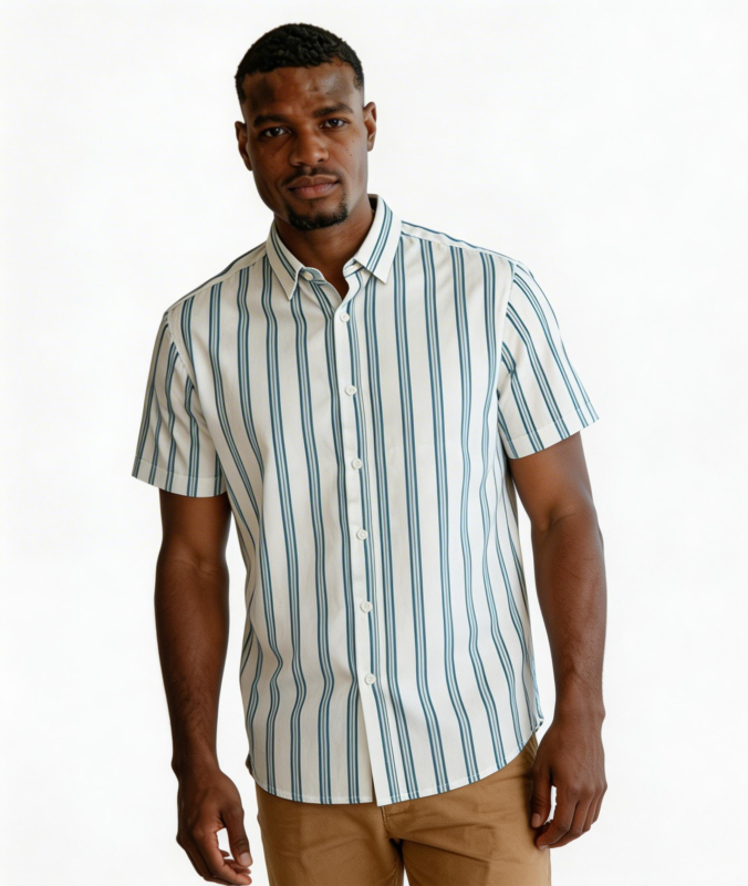 This crisp button-down features a dual-toned vertical stripe in teal and navy on a white base. It offers a structured yet breathable fit, perfect for warm-weather styling.