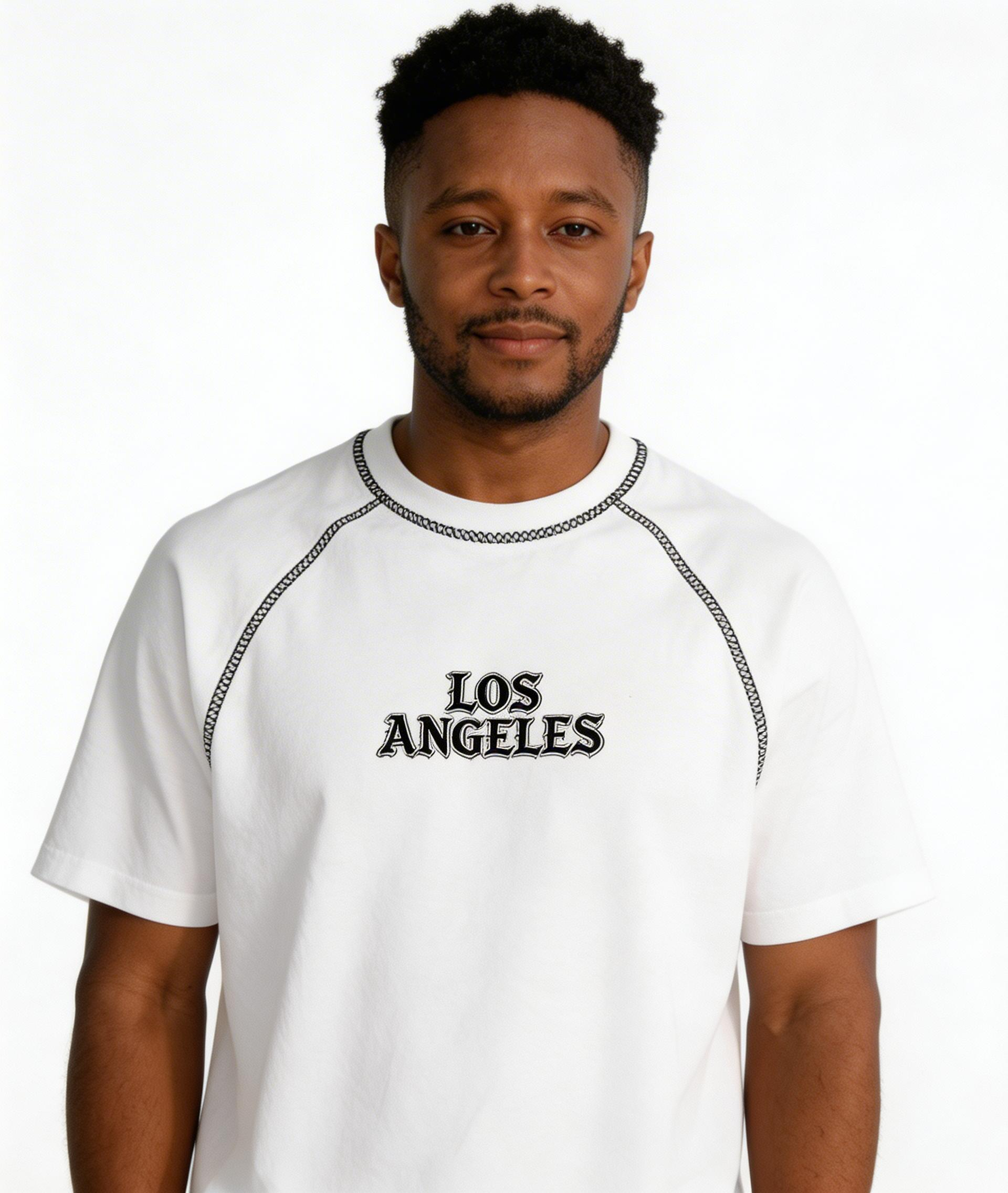 This heavyweight white tee features a bold streetwear aesthetic with a focus on structural detailing. It combines a relaxed silhouette with high-contrast stitching for a modern edge.